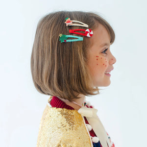 Upgrade your kid's style from ordinary to extraordinary with these snap clips! This set of three features a gingerbread cookie, a Christmas tree, and a candy cane - perfect for the holiday look!