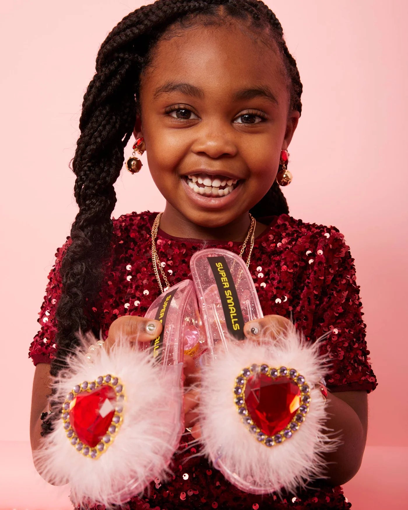 - Glittery pink play heels feature oversized red heart jewel and feather accents