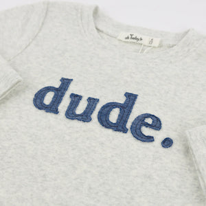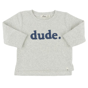 Long sleeve tee with appliqued "dude" across the front. Available in infant, toddler and boys sizes. Designed in Minnesota.