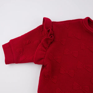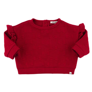 Slouch style sweatshirt featuring ruffle details around the sleeves and puckered bows all over. Make it an adorable set with our coordinating Joggers. Made in a beautiful deep red. Perfect for the holidays.