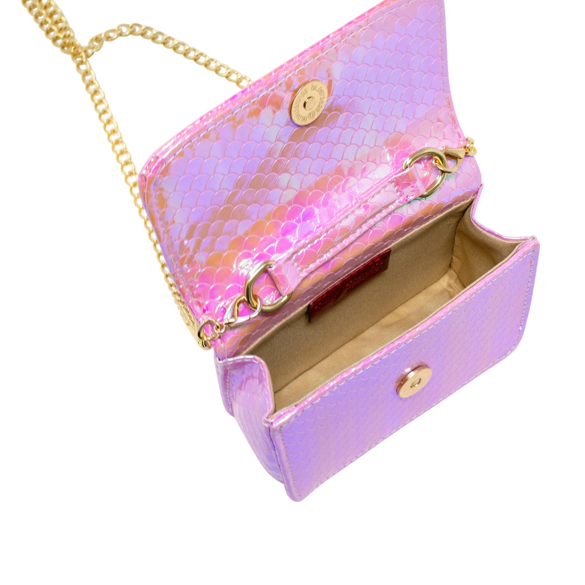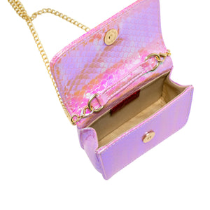 Calling all mini mermaids! This Mermaid Pearl Handle Seashell Bag is the perfect accessory for a day out at sea with its shiny mermaid scale pattern, colorful pearl handle, and a delightful removable seashell charm. Plus, the gold chain strap adds a touch of bougie-ness that's sure to make your little mermaid feel like royalty. Talk about shell-ebration!