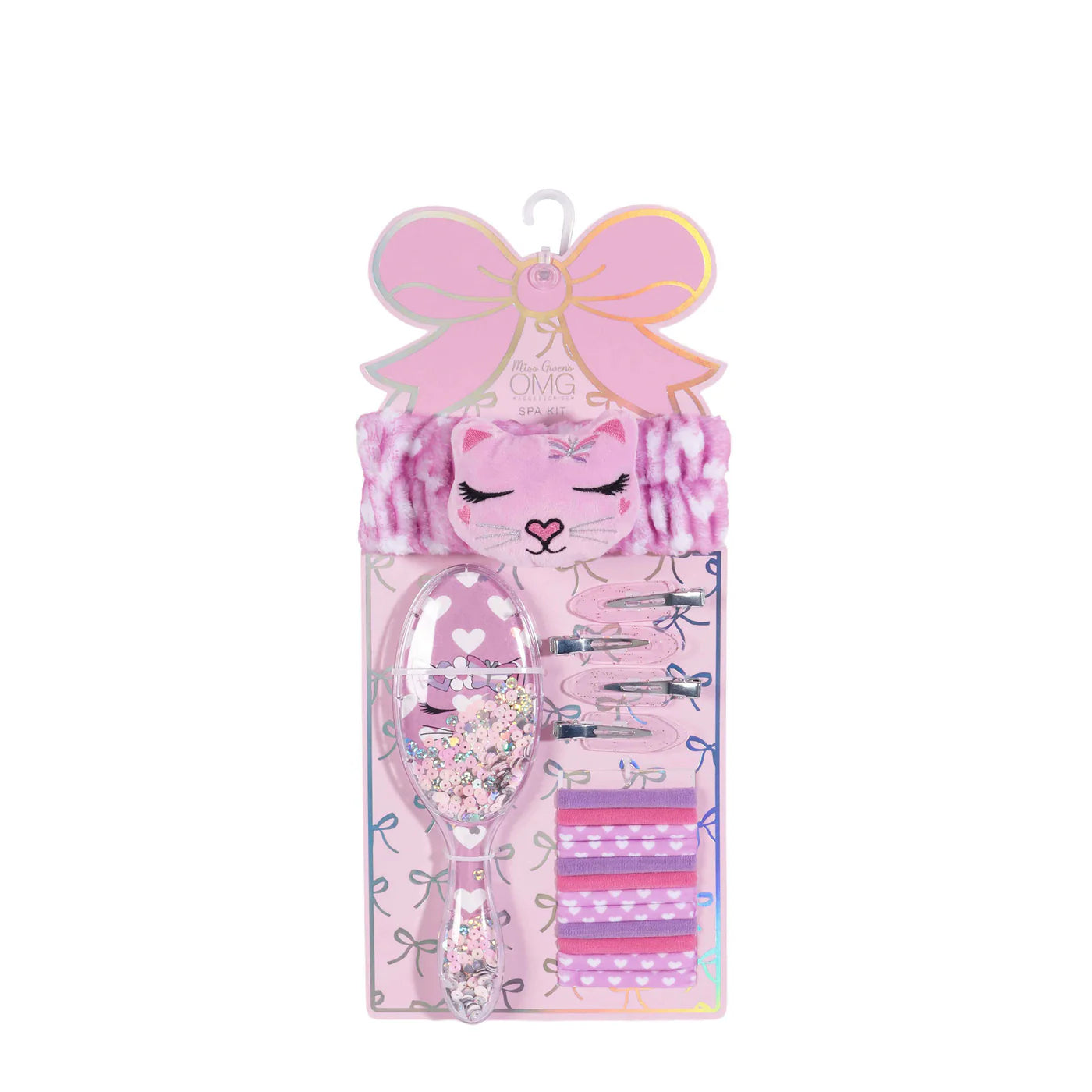 The ultimate spa kit - treat your little one to an at home spa day! This all-in-one kit includes a soft plush Miss Bella kitty cat pink heart printed spa headband and shakey confetti filled detangling hair brush, plus pink and purple glitter creaseless hair clips, and a mix of solid & heart printed tug-free elastic hair ties.