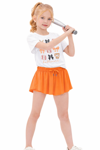 Celebrate Baltimore baseball in style with this adorable coquette-inspired tee featuring the iconic Orioles theme. The shirt showcases "Baltimore" in vibrant orange lettering, perfect for spring training, opening day, and all those exciting games throughout the season. Pair it with orange butterfly shorts for a coordinated look or black bike shorts for a chic contrast. This sweet, feminine design is ideal for young fans who want to show their team spirit while staying on-trend this spring and summer.