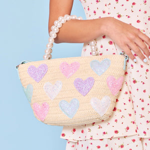 Glitter Hearts Straw Pearl Handle Tote Bag