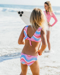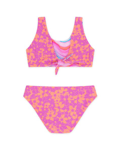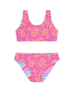Fully reversible two-piece in a sporty square neck top with tie in back, and matching bottoms with reinforced waist band. Featured in bright contrast prints offering mix-and-match versatility and easy wear.