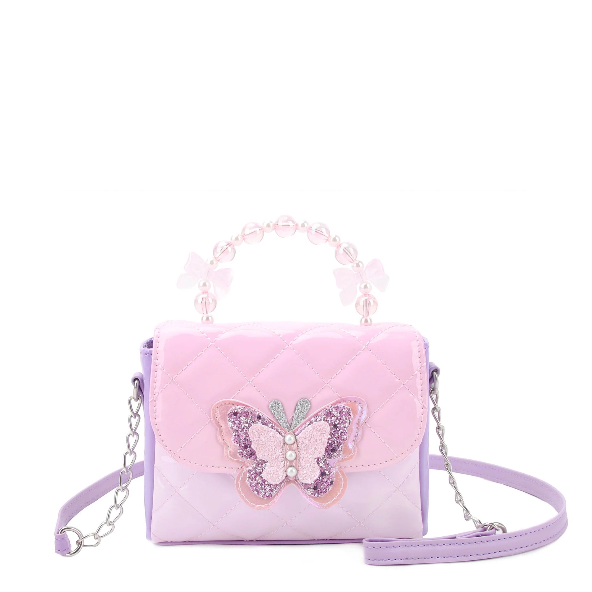 Calling all butterfly lovers! Our pink and purple color blocked mini crossbody bag will make your mini want to spread their wings and fly! Detailed with a beaded top handle, glitter butterfly appliqué, and adjustable crossbody strap for the perfect fit.