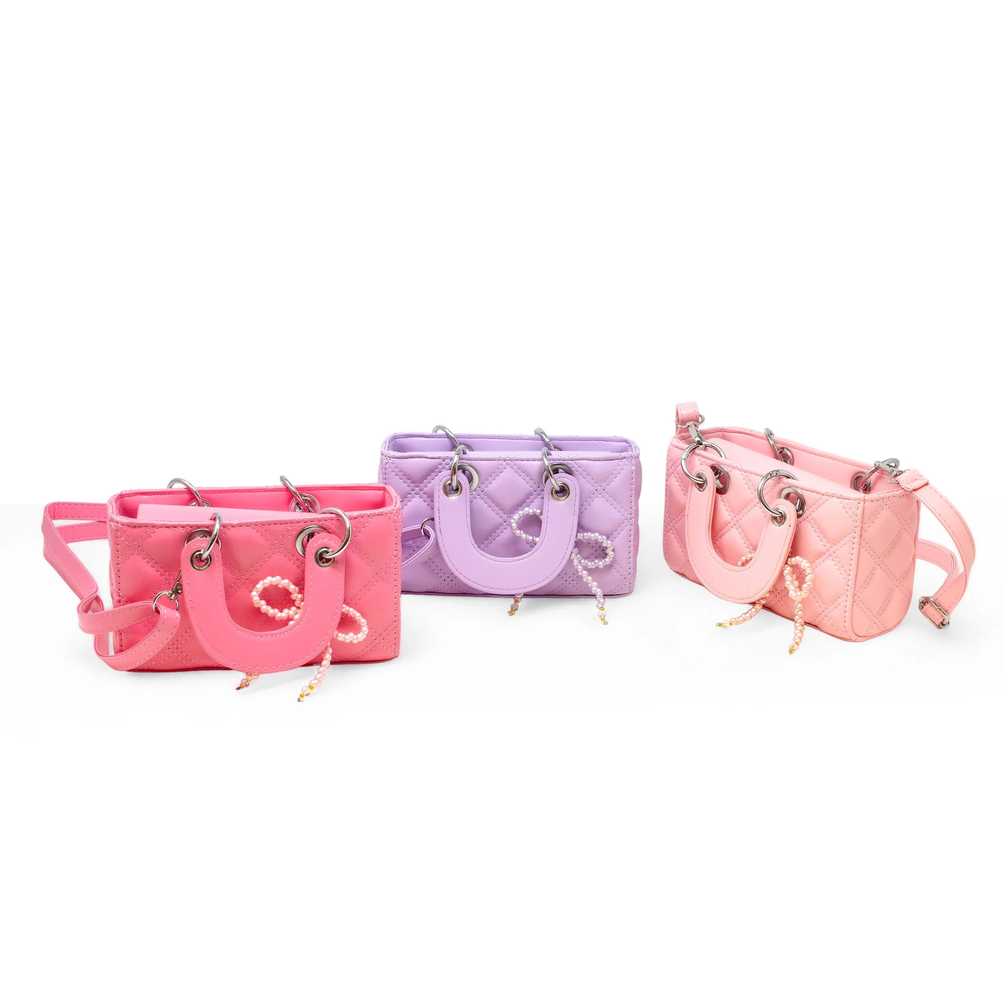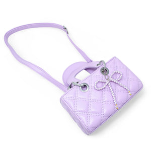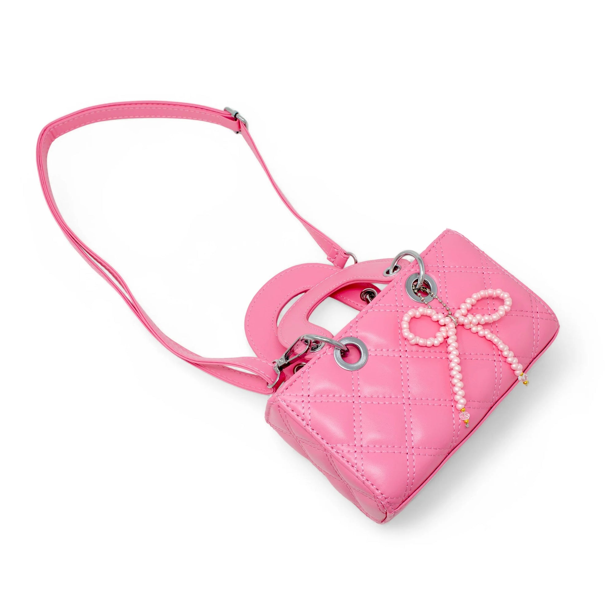This structured quilted handbag features a sleek rectangular shape with sturdy top handles and detailed stitching for a classic look. A delicate beaded bow charm adds a playful, elegant touch. Perfect for carrying everyday essentials in style, whether it’s for dress-up or day-to-day outings.