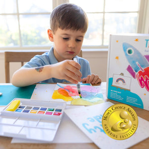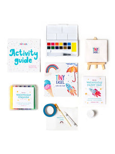 Our Tiny Easel Traveler kit is perfect for traveling and adventures on-the-go. Just bring your Watercolor Book and Watercolor Crayons to the restaurant and come back home to add water to bring it to life. Take the whole kit on vacation and let your kids paint on the beach. Fill the water brush wand with water and your tiny artist is ready to create outside or on-the-go!
