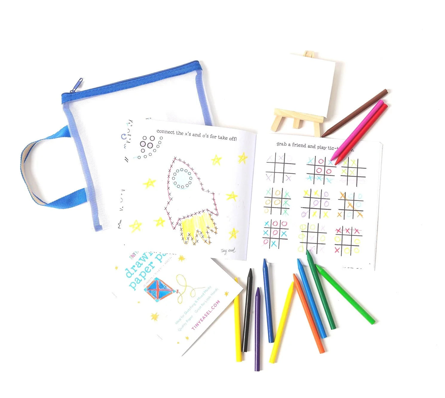 Tiny but oh-so-necessary art kits for busy kids on-the-go. Great for taking out to a restaurant to occupy your kids and spark their imagination with our NEW artist crayons and NEW coloring book! Includes a coloring activity book, 12 vibrant, washable and toxic-free crayons, a drawing pad and … a TINY easel all tucked in an easy carrying bag to color-n-go.